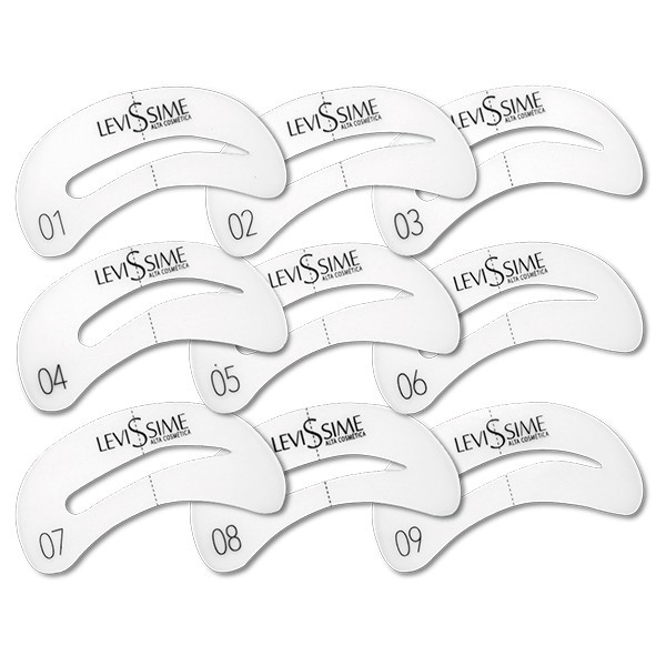 Zestaw 9 szablonów wielokrotnego użytku do stylizacji i regulacji brwi. Wykonane z elastycznego plastiku.